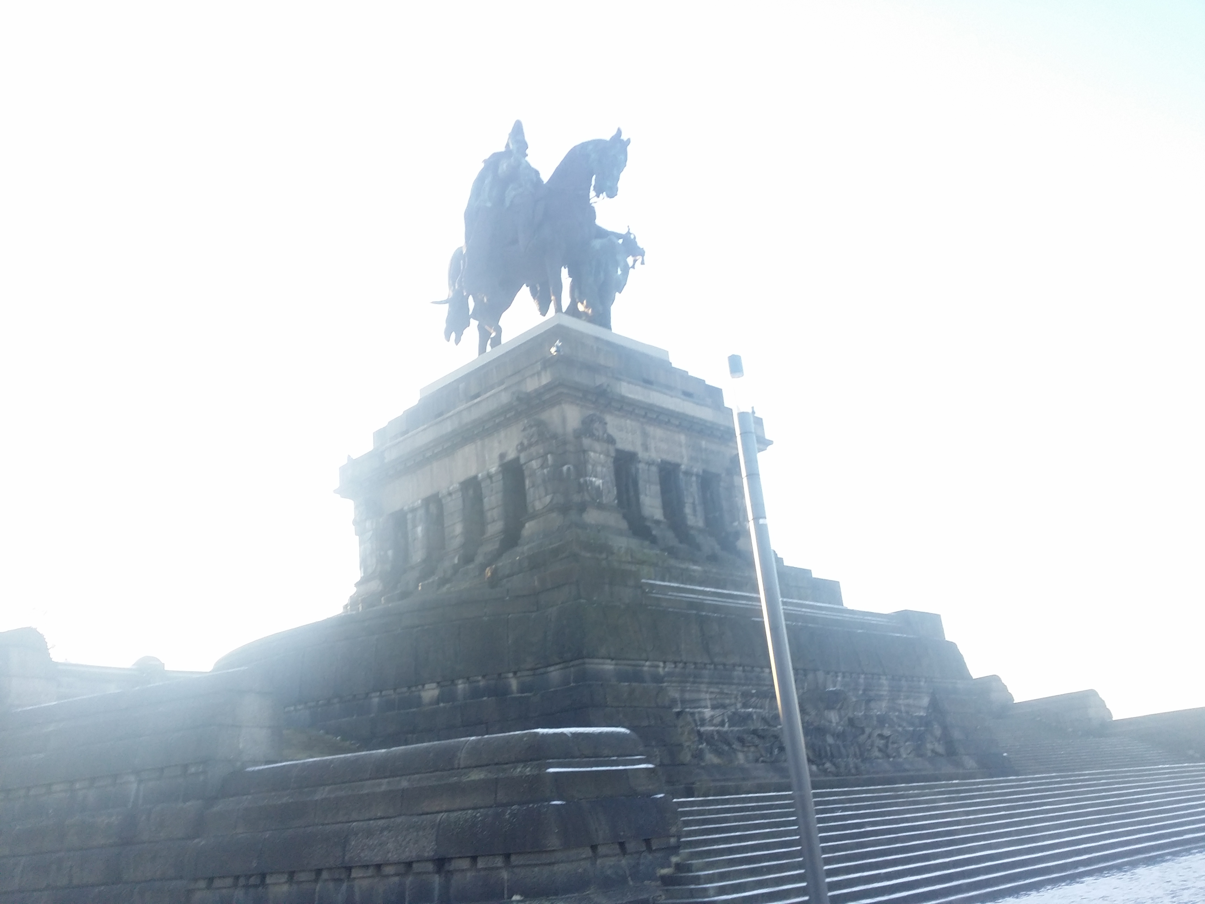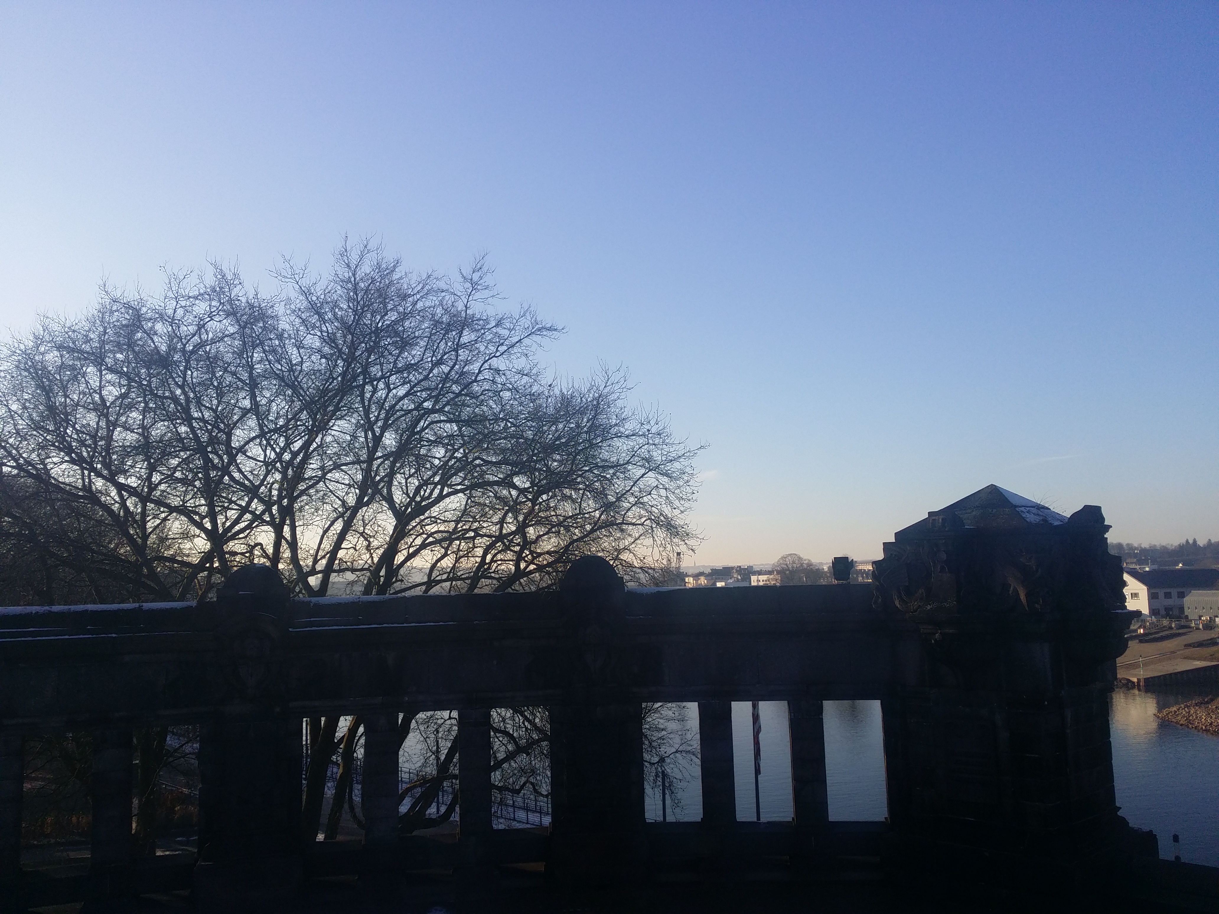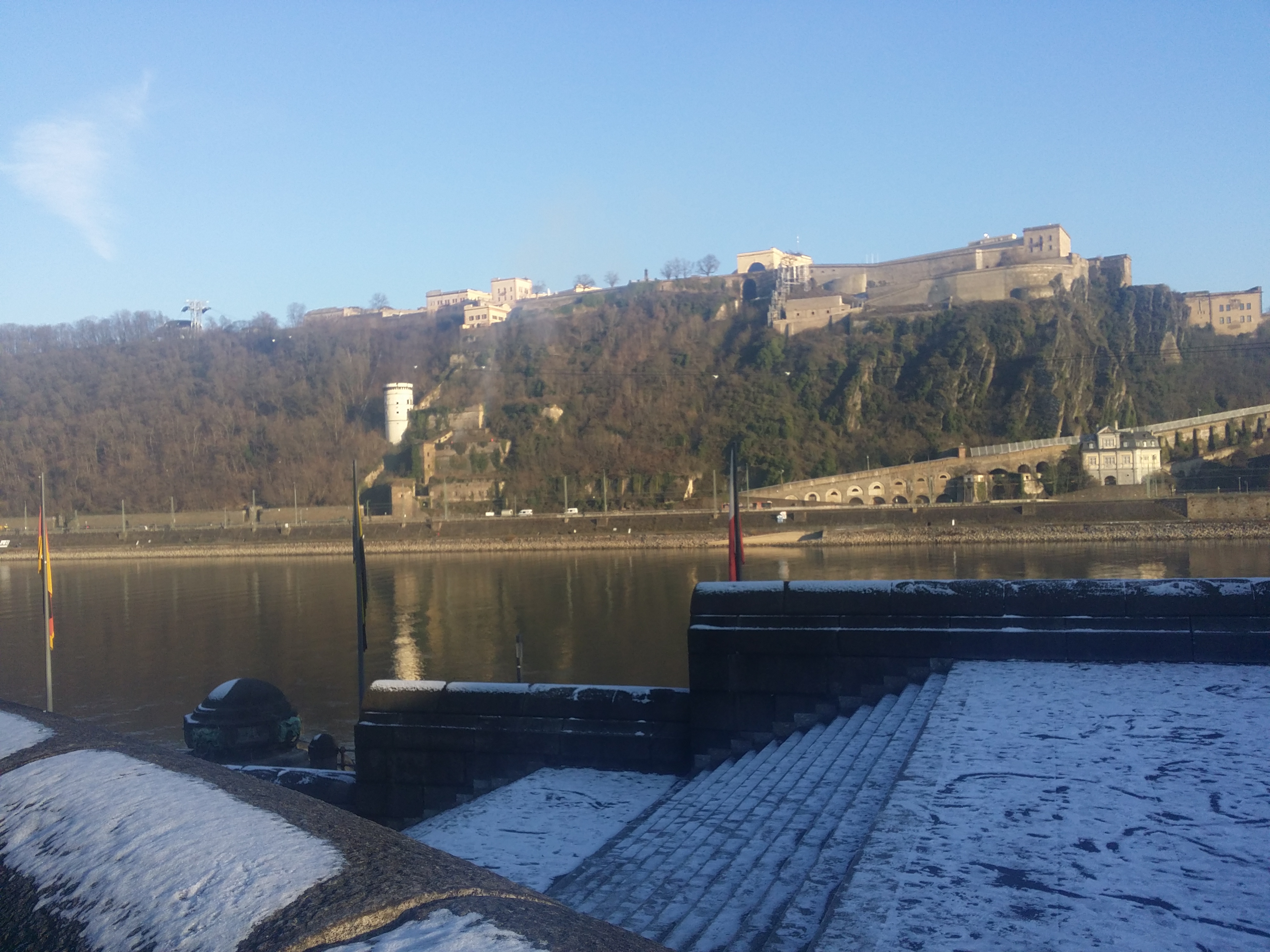 هنا عليك أن تمشي فقط، وأن ترتدي الكثير من الملابس كي لا تشعر بالبرد، فقط امشي،انظر، تأمل ، انظر إلى النهر، إلى العشب الأخضر المكسو بالثلج الأبيض، ثم تصل إلى الزاوية الألمانية، Deutsches Ecke هنا يصب نهر موزيل في نهر الراين الكبير، هذه الزاوية هي رمز كوبلنز، وهنا تجد السياح الكثر، وفوقها يمر Seilbahn..مممم يمكننا اعتباره تلفريك؟ للأسف لم يكن هناك أي رحلات في الوقت الذي تواجدت فيه هناك، لذا استمريت في المشي والبحث عن مطعم لتناول الغذاء.